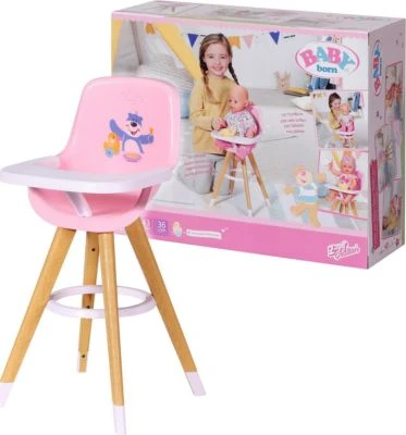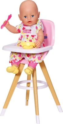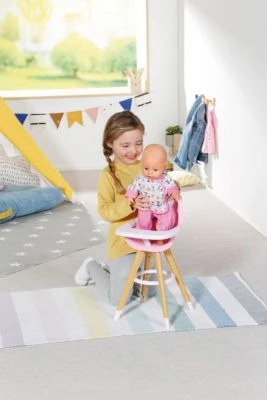 Im praktischen Hochstuhl kannst du BABY born ganz einfach füttern. Der Stuhl im skandinavischen Design hat Beine in Holz-Optik und einen bequemen pinken Sitz. BABY born Hochstuhl von Zapf hochwertiges Zubehör für die BABY born Markenspielpuppe auch für kleinere Puppen geeignet (36cm bis 43cm) ab 3 Jahren Bär Bruno und Ente Berta warten auf der Rückenlehne auch schon gespannt aufs Essen. Auf dem hellrosa Tischchen haben BABY borns Breiteller und ihre Flasche Platz. Und natürlich ist das Tischchen nicht nur zum Essen da. Hier darf auch gemalt, gebastelt und mit Bauklötzen gespielt werden.