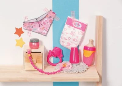 Das Zapf Creation BABY born® Accessoires-Set besteht aus sechs wichtigen Basisteilen zur Babypflege, die man als Puppeneltern so braucht. So sind neben einer Windel, einer Puderdose und einer Cremedose auch eine Flasche, ein Stofftuch, eine Rassel und ein neuer Magic Schnuller mit Schnullerkette dabei.
