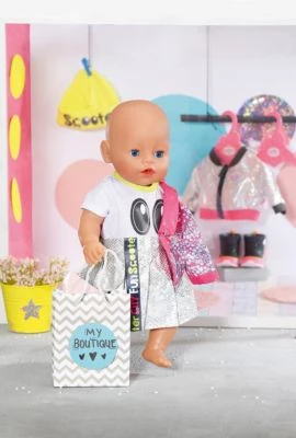 Bei einem Ausflug in die City geht es ja schon um Sehen und Gesehen-Werden. Und manchmal fühlt man sich regelrecht beobachtet. Das könnte aber auch an dem Druck auf BABY borns weißem Shirt liegen. Zwei riesengroße Augen schauen einen neugierig an. Das stylishe City Girl trägt darüber eine pinke Jacke, die über und über mit kleinen Diamanten bedruckt ist. Der silberne Faltenrock hat ein symmetrisches Rautenmuster. Vom Saum hängt eine Art schwarze Schärpe mit auffälligem Print. • Hochwertige Kleidung für die BABY born Markenspielpuppe. • Für erweitertes, abwechslungsreiches und langanhaltendes Spielvergnügen. • Kinderleichtes An- und Ausziehen. BABY born City Outfit 43cm aus Jacke, Shirt und Rock. Inkl. Kleiderbügel.