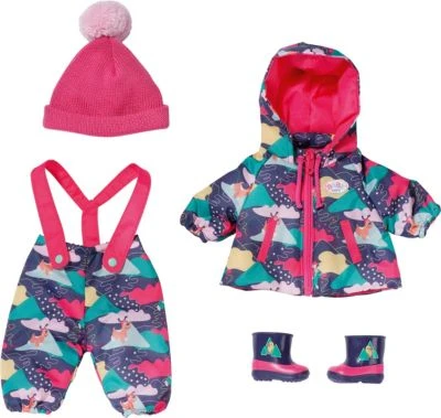 Das Muster von BABY borns Schneeanzug sieht fast ein bisschen aus wie das top aktuelle Camouflage. BABY born Deluxe Schneeanzug 43 cm von Zapf Creation bestehend aus Jacke, Hose, Mütze und Stiefeln hochwertige Kleidung für die BABY born Markenspielpuppe für Puppen bis 43 cm kinderleichtes An- und Ausziehen für erweitertes, abwechslungsreiches und langanhaltendes Spielvergnügen aus Textil und Kunststoff ab 3 Jahren geeignet Ob sie sich damit wirklich im Schnee tarnen kann, ist fraglich. So ganz unauffällig ist es nun auch wieder nicht. Naja, die riesige Bommel auf der rosa Strickmütze würde wohl eh hinter dem Schneehaufen hervorschauen. Den Puschel könnte BABY born allerdings noch unter der Kapuze der Jacke verstecken. Die Hose hat extra Hosenträger, damit im Schneeball-Gefecht alles an seinem Platz bleibt. Die stabilen Stiefel haben ein grobes Profil, für guten Grip auf Eis und Schnee.