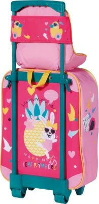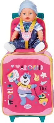 Wenn die ganze Familie auf Reisen geht, muss natürlich auch BABY born dabei sein. Sie darf aber nicht einfach im Koffer verschwinden, sie soll schließlich auch etwas von der Reise mitbekommen. Mit dem süßen Trolley geht’s deshalb um die Welt, around the world. BABY born Holiday Trolley mit Puppensitz von Zapf für Puppen bis 43cm (auch für kleinere Puppen geeignet) ab 3 Jahren In das Gepäckstück mit extra Aufbewahrungsnetz im Inneren passen allerhand Puppen- und Kinderkleider, sowie BABY borns Windeln und ihr Fläschchen. Die kleine Weltentdeckerin kann dann bequem oben auf dem Trolley im Reisesitz Platz nehmen. Der Sitz wird am höhenverstellbaren Henkel des Rollkoffers befestigt und BABY born darin gut mit dem Gurtsystem angeschnallt. So ist sie immer mit dabei und kann alles gut beobachten. Hinweis: Hochwertiges Zubehör für die BABY born Markenspielpuppe