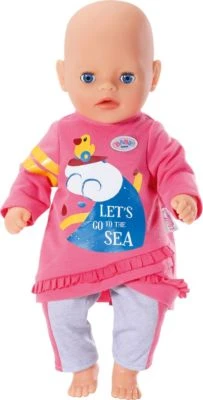 In der Freizeit ist die Little ganz lässig unterwegs. Wie Ente Berta auf dem Shirt, surft sie auf einer Welle der Gelassenheit. Zum Chill Out trägt sie eine bequeme graue Jogginghose mit pinken Seitenstreifen und ein rosa Shirt. Das Oberteil ist mit Surfer Ente Berta bedruckt und hat einen asymetrischen Rüschenabschluss. Das Outfit ist im easy fit Style gefertigt und kann sogar von kleinsten Kinderhänden entspannt an- und ausgezogen werden. • Hochwertige Kleidung für die BABY born Markenspielpuppe. • Für erweitertes, abwechslungsreiches und langanhaltendes Spielvergnügen. • Im easy fit Style für leichtes An- und Ausziehen. BABY born Little Freizeit Outfit pink 36cm aus Shirt und Hose. Inkl. Kleiderbügel.