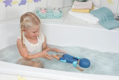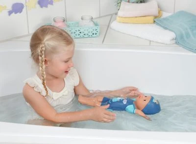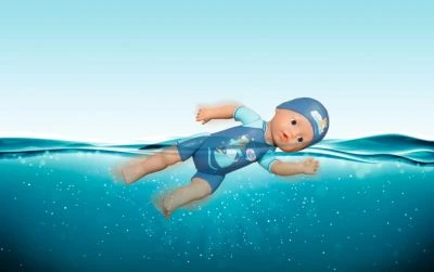 Wer schwimmt denn da? BABY born® hat schon schwimmen gelernt. Mit diesem bezaubernden BABY born® My First Swim Boy von Zapf Creation macht das Wasservergnügen gleich doppelt Spaß und kleine Puppeneltern können ihren Kleinen zugucken, wie sie sicher durch das Wasser kraulen. Und nicht nur das ? den Schmetterlingsstil beherrscht der kleine Kerl auch schon. Die tolle Schwimmpuppe wird durch das Drehen der Arme aufgezogen und schwimmt dann mithilfe des Aufziehmechanismus mühelos ein paar Bahnen in der Badewanne oder im Planschbecken. Beim Kraulen tauchen die Arme nacheinander ins Wasser und beim Schmetterlingsstil werden beide Arme eingetaucht. Ob sich die Puppeneltern hier sogar was abschauen können? Die beweglichen Beine und der Kopf sorgen für noch mehr Spielespaß und das niedliche Schwimm-Outfit ist ein leicht erhabener Print. Für tolle Spielemomente im Wasser und auch außerhalb!